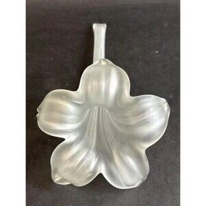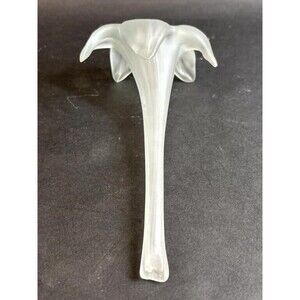 7 art glass trumpet lily vase with a narrow clear stemjust enough for maybe one stem or a few small budsand frosted lily-shaped opening. The flower is not flat on the side that can rest horizontally, so it could also be displayed standing up with some kind of support. Please feel free to message me with any questions. I have and strive to keep 100% happy buyers.