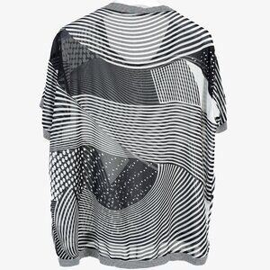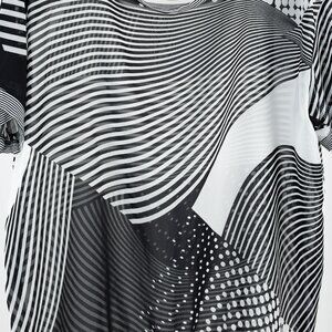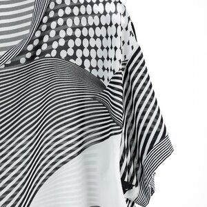 This blouse from Art Point is crafted in black and white synthetic chiffon, and is printed in a mix of stripes and polka dots. It features short sleeves, a crew neck; and striped jersey trim on the cuffs, neckline, and banded hem.