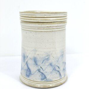 Art Pottery Beige Ribbed Rim Vase Blue Abstract Design Signed Doan