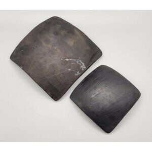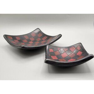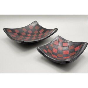 Two decorative handcrafted red and black checkered pottery bowls. They are concave and square shaped. Not recommended for food use. Likely made in Mexico or Central America. Unsigned.