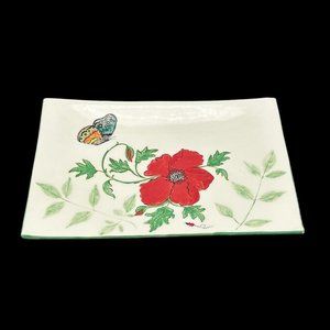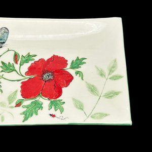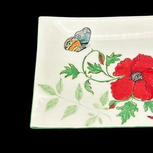 Art Pottery Poppy Flowers Butterfly Rectangle Plate Ceramic Hand Painted 11 x 7"
