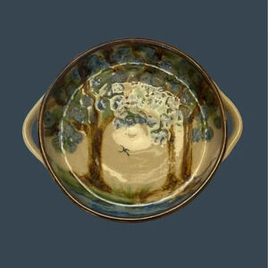 Art Pottery Serving Dish Bowl Artist Signed Bowl w/Handles Woodland Scene