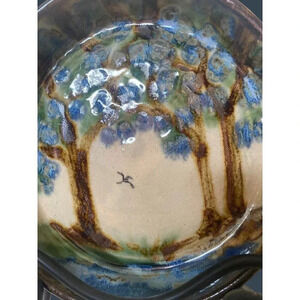 Original Artist Signed Art Pottery Catch-All Bowl w/Handles Trees Woodland Scene with a Bird in Flight. Great for serving in the kitchen or as a "catch--all" by the front door for keys, etc.