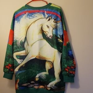 Soft and silky Art Print top. Long with banded crewneck, sleeves and hem. Perfect with leggings. Fabric has nice weight and drape. One size.