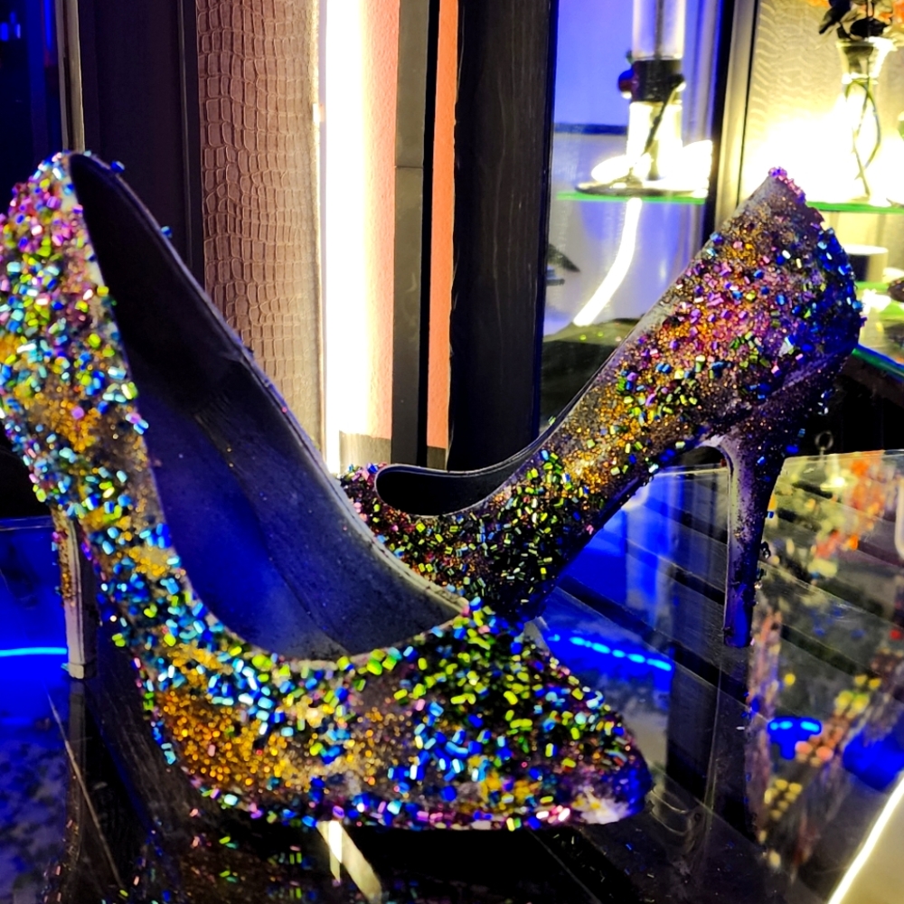 black upcycled high heals. hand painted and decorated. great for a red carpets or to be displayed on a wall. proceeds go to support hooplasports.org a non-profit organization supporting inner-city youth