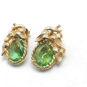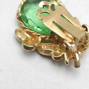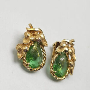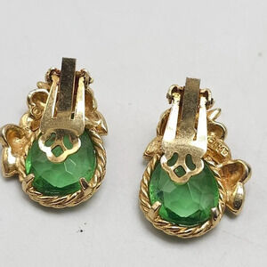 These vintage clip-on earrings exude a timeless elegance, showcasing vibrant green teardrop stones nestled within a sophisticated gold-tone leaf design. The craftsmanship reflects an era of detailed artistry, making them a classic choice for those who appreciate vintage jewelry's unique charm. The art signature adds collectible value to these pieces.