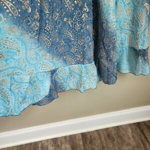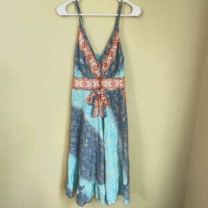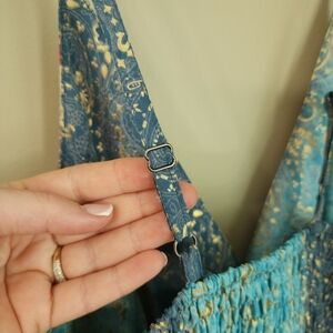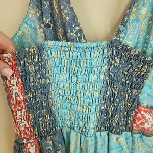 Art Silk Bohemian Blue and Red Sundress Tie Drewstring Waist Shirring Back adjustable straps gold shimmer detail