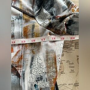 painting in multi colours "collage" like print, high neck, front zipper, long sleeves, pockets, contrasting details, comfortable flattering fit, stretchy fabric. Must have,
