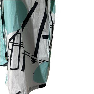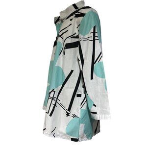 The Art To Wear Cupcake International Memphis Abstract large 100% Cotton Jacket Shirt is a stylish and unique piece of clothing for women. Made from 100% cotton with a black abstract pattern, this jacket features a button closure and is perfect for casual occasions in the fall and spring seasons. The art-inspired design from the brand Cupcake International adds a touch of artistic flair to the wardrobe, making it a standout piece in a size L