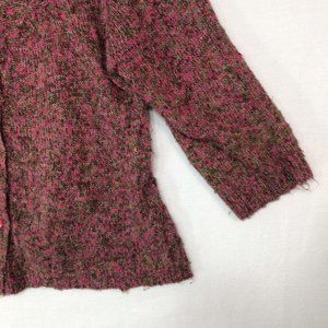 Cute button front cardigan sweater. Round neck, 3/4 sleeves, pink buttons. Yarn is a pink color mixed with greens and browns. Fuzzy, but I think its how its made, not piling. See pics.