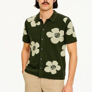 Stylish blue button-up shirt with floral pattern. Features short sleeves and a classic collar.