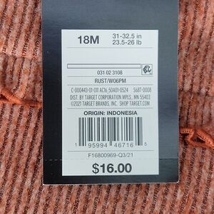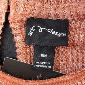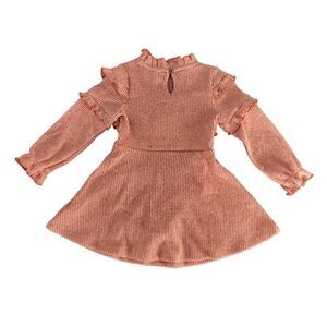 This rust colored sweater dress from Art Class is rib knit for a stretchy fit. Ruffles around the chest and arms. Button at neck. Includes matching bloomers. Content: dress 95% polyester, 5% spandex; bloomers 60% cotton, 40% polyester. Care: machine wash, tumble dry.