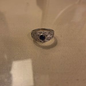 Art Deco 18k white gold band with real pave diamonds and sapphire ring