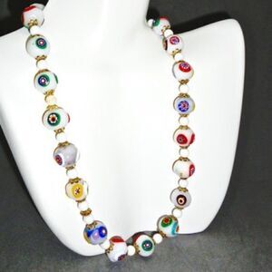 STUNNING VINTAGE NEW OLD STOCK UNUSED ART DECO MILLEFIORI WHITE MURANO GLASS BEAD NECKLACE WITH MULTI COLOR INFUSED DESIGNS, THE BEADS ARE SEPARATED WITH SMALL WHITE GLASS BEAD, EACH BED HAS A LOVELY BRASS FILAGREE BEAD CAP WHICH MAKES THIS LOVELY NECKLACE VERY ORNATE..