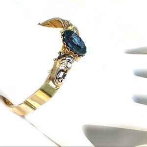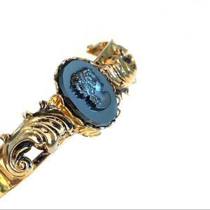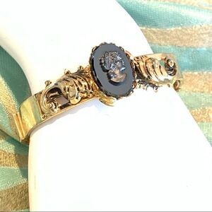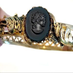 Beautiful vintage Art Deco/ Victorian design gold plated cameo bangle bracelet. It has a filigree back with granulated design. Hinge works perfectly, overall the bracelet looks like it has little wear. The black glass cameo is right facing. Possibly it’s signed on one of the leafs but I could not make out what that might be. Very nice item, measures 2.5” across and 2’ high, .75” at the widest. See all photos for full description.