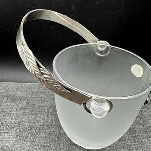 Vintage Creazioni Silvestri Arte Murano Crystal Ice Bucket with Tongs - Frosted Crystal Glass with metal rose applique - Murano Glass - Made in ItalyThis is a unique art glass ice bucket by Creazioni Silvestri and was made in Italy in Murano. The heavy glass is beautifully shaped and has leaf and rose design. A Silvestri sticker is affixed to the bucket.The bucket is 5" tall (9 1/4" tall with handle raised) and the bucket opening is 4 ½ inches in diameter. It is in very good overall vintage condition with no chips, cracks or crazing noted. The silver tone handle and thongs are in good condition with some small areas of tarnishing or water marks that can likely be polished out. There is some wear on the rim of the bucket. Please see pictures for overall condition.