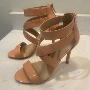 Keywords: Artelier Nicole Miller, heels, strappy, open toe, stilettos, beige heels, size 6.5M, dress shoes, ankle strap heels, patent leather heels, party heels, women's shoes, formal heels