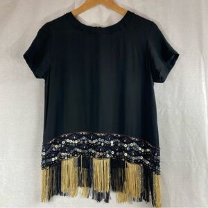 Artelier Nicole Miller Silk Beaded Sequined Top Black Gold Fringe Sheer Small