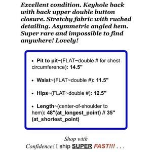 Excellent condition. Keyhole back with back upper double button closure. Stretchy fabric with ruched detailing. Asymmetric angled hem. Super rare and impossible to find anywhere! Lovely!