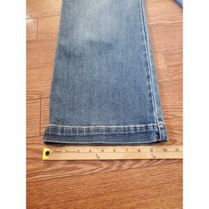 This pair of jeans are in excellent pre-owned condition. They don't look like they've ever been worn. They have an adjustable waist. There are 2 buttons on each side of the waist that can be tightened. These are wide-leg, ultra high-rise. They are an ankle length with a 26 inch inseam. They are a straight wide leg and have really good stretch. Leg opening is 10 inches. They're super comfortable.