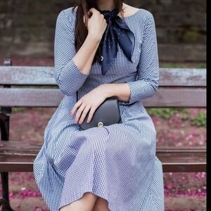 “Rosa Femina is a new take on our best-selling model. The dress is made of elastic, high cotton content quality blend. The subtle gingham check will flatter every skin type. The dress has a slightly lowered waistline, which optically slims the silhouette, a low neckline and five hand covered buttons at the back. A kimono sleeve provides for a comfortable wear.”