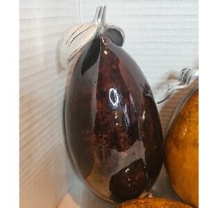 Vintage Artesana Home Resinated Glossy Weighted Gourds decor Pewter Stem and leaf on each. Purple Eggplant, Green Melon, Orange Gourd, Gold Small Gourd. Rich colors, Mottled brown color mixed in. Were displayed in Large glass bowl on table so two have of mild scratches from other (see last Pic). See another listing for 2 Orange fruits I can ship together to save postage.