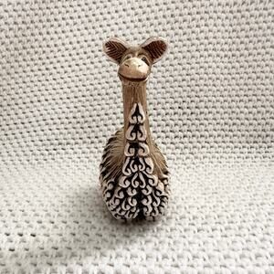 From Artesania Riconada. Vicunia Llama. Long neck animal figurine wiht curved white enamel painted "locks" of fur Preowned in good condition with no major chips or stains.
