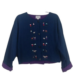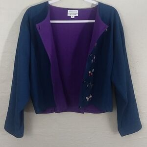 Artesania Sorata Bolivia Women's Handmade Blue/Purple Spanish Theme Embroidered Long Sleeve Button Front Collarless Box Jacket.