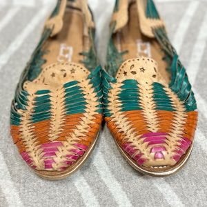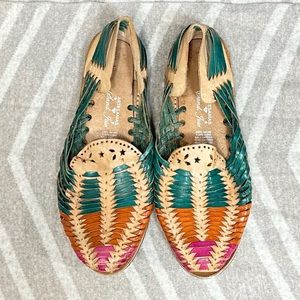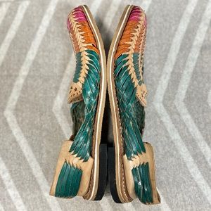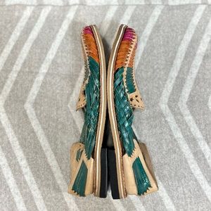 Artesanias Mexican Huaraches Sandals [S6712]. Size 5. Artesanias Mexican Huaraches colorful leather. These are a Mexican size 5 which fit like a women’s size 8/8.5. Very good pre-owned condition with signs of wear normal. Item #S6712
