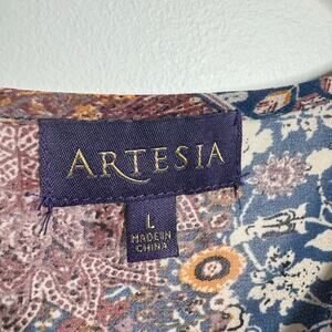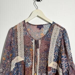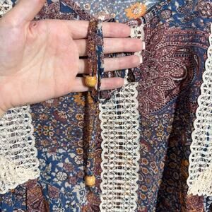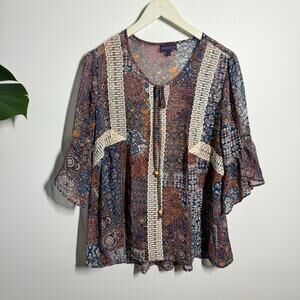 Artesia Top Women L Brown Blue Patchwork Floral Lace Boho Bell 3/4 Sleeve Blouse