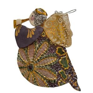 This beautiful angel ornament is a unique addition to any collection. Handcrafted from clay and glaze, this vintage piece features intricate hand-painting and is perfect for the holiday season or year-round display. The ornament measures 5 inches in length and 4 inches in width, with a weight of 4 oz.