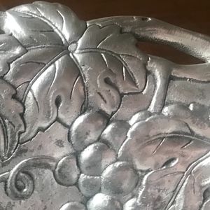 Arthur Court grape design salad bowl is stunning. Features a beautiful grape design with open fretwork around the edges. Leaves, vines and bundles of grapes create an incredibly detailed mixture of texture. Twisting vines form the openwork border of this handmade, aluminum piece as foliage and fruit appear to hang from it in plentiful amounts