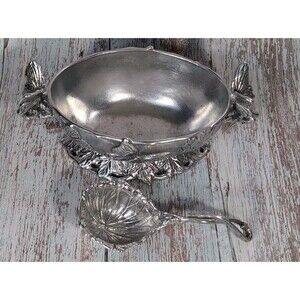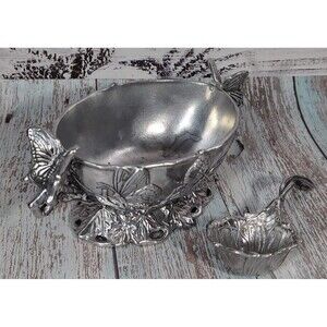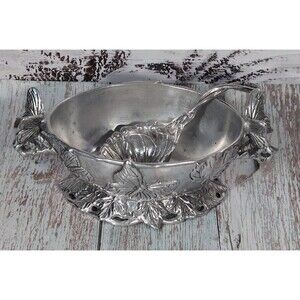 The Arthur Court Gravy Boat with Ladle in Butterfly Motif is a stylish and functional addition to any dining table. This oval-shaped gravy boat, finished in a matte silver color, features a beautiful butterfly pattern and comes with a matching ladle for easy serving. Made of aluminum, this 10-inch by 5-inch piece is both durable and elegant, perfect for all occasions.