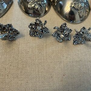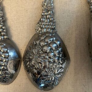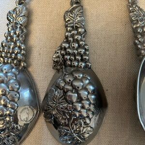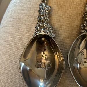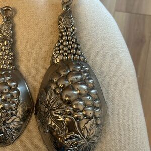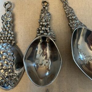 Set of 4 grape measuring cups with wall hangers. In good condition! Never used for food, just for decoration. Will need some light cleaning (made of aluminum, not dishwasher safe!). The large 1 cup is approximately 9.5” in length.