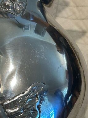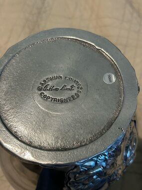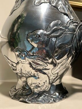 Decorative Arthur Court pitcher with detailed rabbit and foliage relief. Sculpted handle and embossed surface. Lustrous silver color highlights the sculpted details. Elegant display piece for mantel or table.