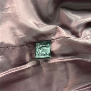 Tahari faux leather blazer, fully lined, two front pockets, with princess seams on front and back for a tailored look. The front closure is a hook and eye closure that keeps the lines clean. The front of the jacket extends longer than the back, which makes this flattering for all shapes.