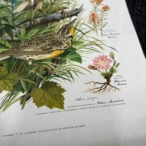 Vintage mid century "Portfolio of Bird Prints" botanical art by Arthur Singer for The American Home magazine from the 1950's. This print is number 7 in the series and shows the Western Meadowlark and multiple plants and measures approximately 10 inches by 13 inches. There is some curling of the prints. Please see photos for condition.