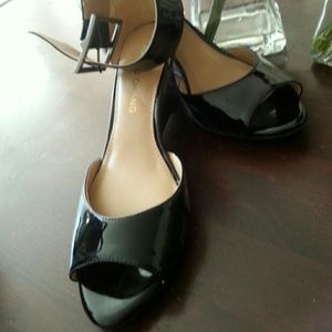 Size 6, shiny black wedge with sexy ankle strap style with buckle. Perfect addition to wardrobe. These were just too big for me unfortunately. Never worn! BRAND NEW.