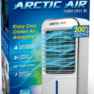 Introducing Arctic Air® Turbo Chill XL, the large area evaporative cooler. Arctic Air® Turbo Chill XL is designed to help cool and humidify your space! The secret is the Hydro-Chill® technology. Simply add water to Arctic Air® Turbo Chill XL easy fill tank, turn it on, and enjoy cooler, chilled air…practically anywhere**! This powerful space cooler features three speed controls: low, medium, and high and oscillates for side-to-side, larger area coverage. Arctic Air® Turbo Chill XL has 3 quiet speed settings, LED nightlight, and auto shut-off timer. It also has cooling control and can be used with and without water. Best of all, it can run for up to 8 hours per fill*, so you can worry less about constantly adding water. Experience the cooling comfort of the Arctic Air® Turbo Chill XL!