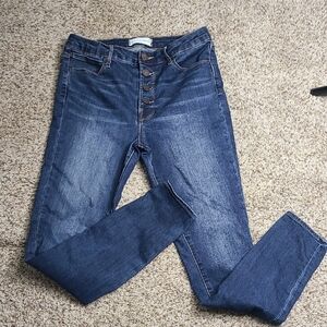 Classic dark blue denim jeans with button closure. Ideal for everyday style. Stylish button up design.