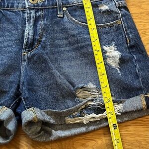 These blue jean shorts from Articles Of Society feature a stylish distressed design with a cuffed hem, offering a casual and relaxed look. The medium-to-dark wash denim adds a touch of modern flair, making them perfect for everyday wear.