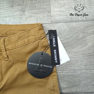 A most excellent pair of Articles of Society mid rise ankle skinny jeans, newly fashioned in a handsome brown hue that would complement any lady's wardrobe. The delightful blend of cotton, viscose, and a touch of spandex ensures both comfort and elegance, perfect for promenades through the village or casual afternoon visits with one's most cherished acquaintances.