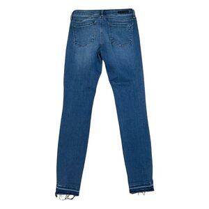Articles of Society Sarah Skinny Jeans in Blue Med Wash Distressed Stretch Denim. They are a Low-Rise Classic 5 Pocket styling and stretch pant with a Destroyed Raw Hem and with Distressing throughout. It is great for casual days at work, school, date night, night out with the girls, and Family Dinner.
