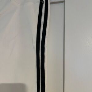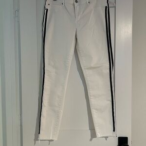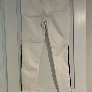 Stylish white denim by Articles of Society with bold black accent stripes. Perfect for a trendy outfit. Has good stretch. Slight color transfer on right leg. Very minor and not noticeable.