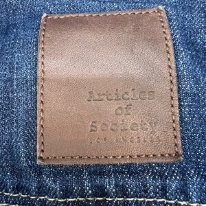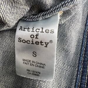 Articles of Society Women's Denim Jacket.. Tagged size small and is blue in color with a medium denim wash. This button up denim jacket is collared and has 2 breast pockets as well as two regular pockets. In good preowned condition and is made of 99% cotton and 1% spandex for stretch.