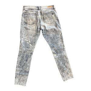 These jeans feature a bold acid/snow wash look with a light blue and white splatter effect that gives them a unique, edgy vibe. They are a skinny-fit style, perfect for contemporary casual looks.