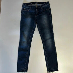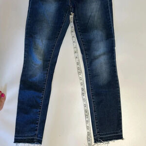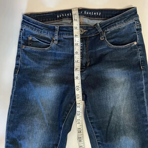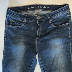 These are articles of society, blue denim jeans, and a darker color. They are 55% cotton 23% polyester 10% rayon 2% spandex. Super comfortable. Hand wash machine wash cold water inside out with the same colors. Bought at Nordstrom.