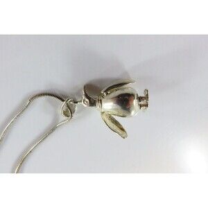 Vintage articulated sterling silver penguin pendant with movable features, including rotating wings, wiggling feet, and a turning head. Comes with a 16" sterling silver snake chain with a lobster clasp, noted to have wavy kinking and tarnish. The pendant is in very good condition and detailed in a playful three-dimensional form.