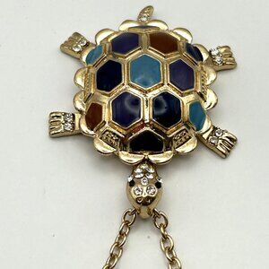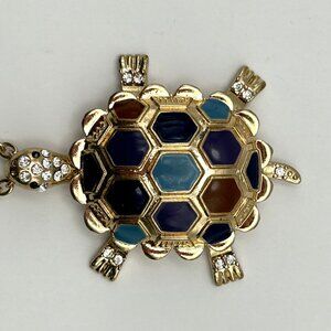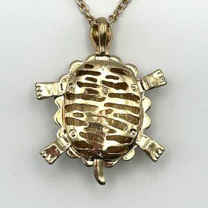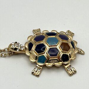 Articulated Turtle Pendant Necklace Enamel Shell Rhinestones 30-33 inches