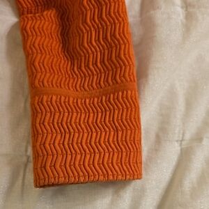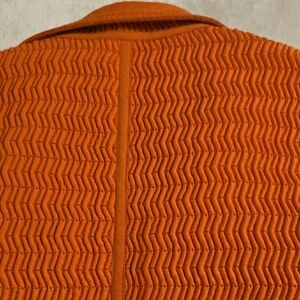 This eye-catching orange blazer is crafted from textured nylon featuring a fitted silhouette that adds a touch of sophistication to any outfit. Perfect for autumn, this medium-weight jacket offers a vibrant pop of color to your wardrobe. In the pictures looks more yellow but is more orange and not too bright.